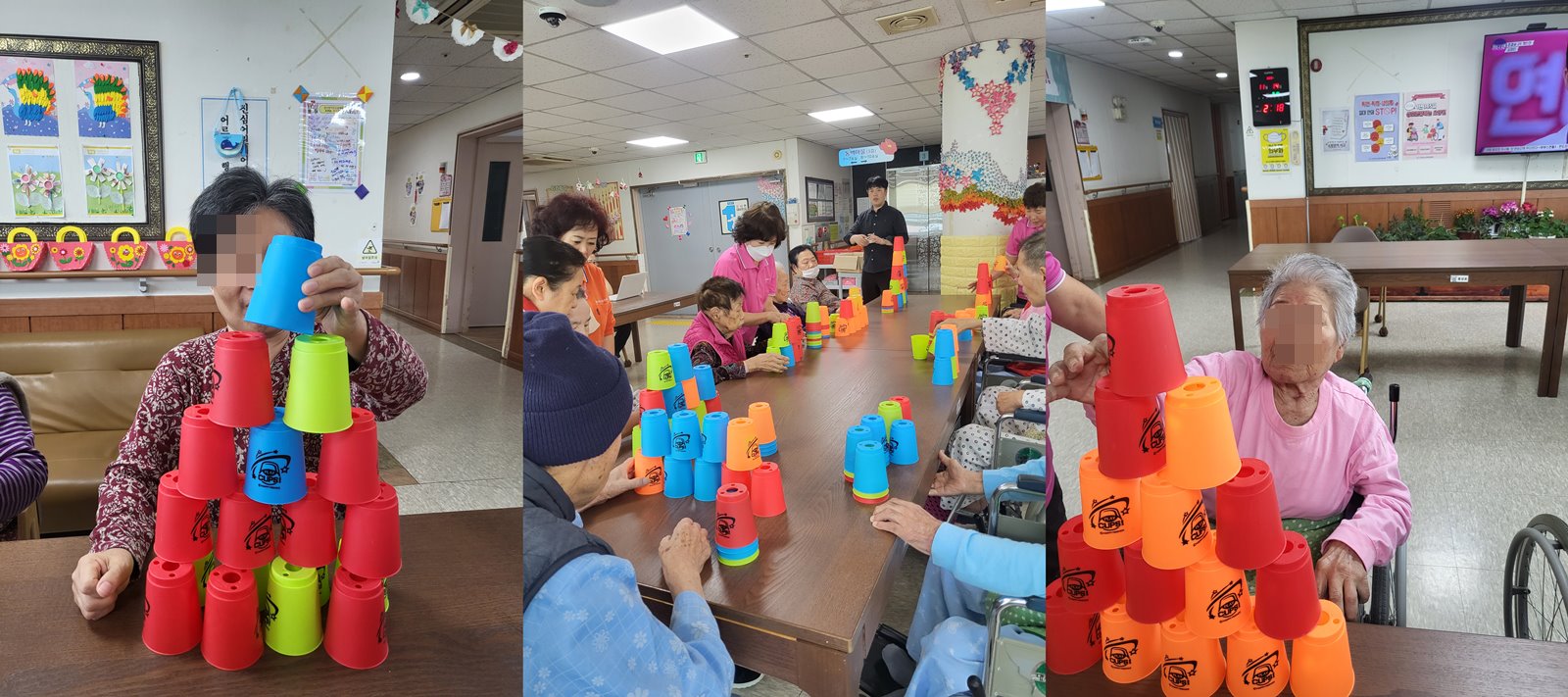 어르신들께서 언제나 재미있게 하시는 컵쌓기 시간입니다~