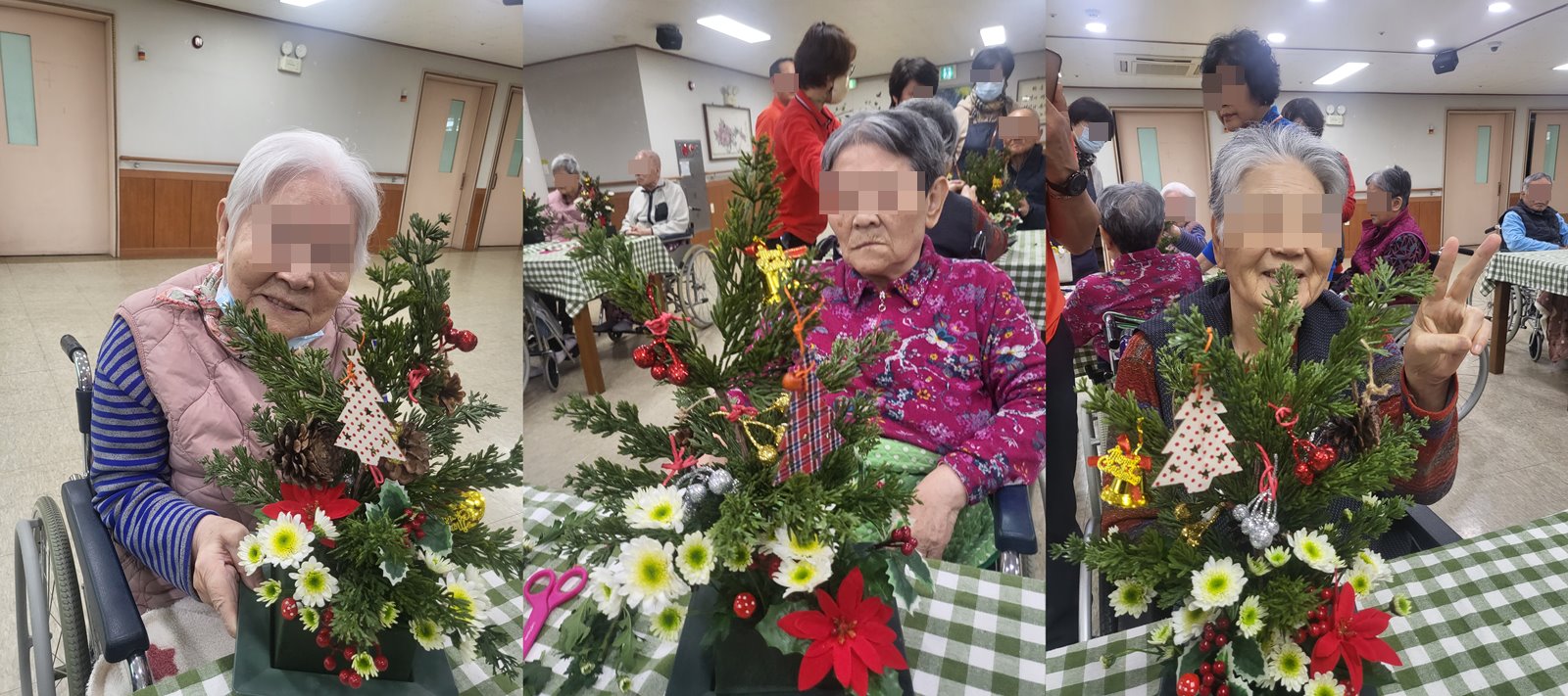 소나무에 크리스마스장식 등으로 미니 트리 꽃꽂이를 해보셨답니다.