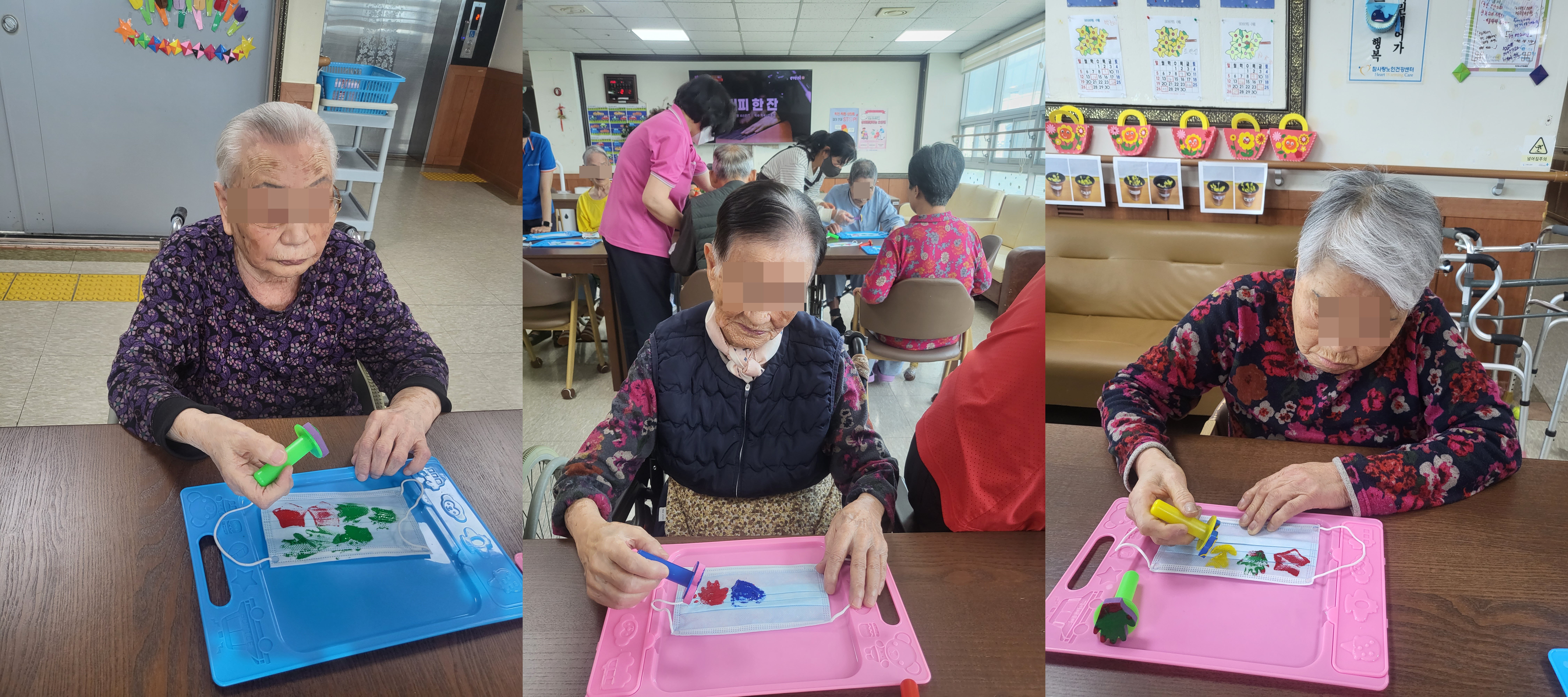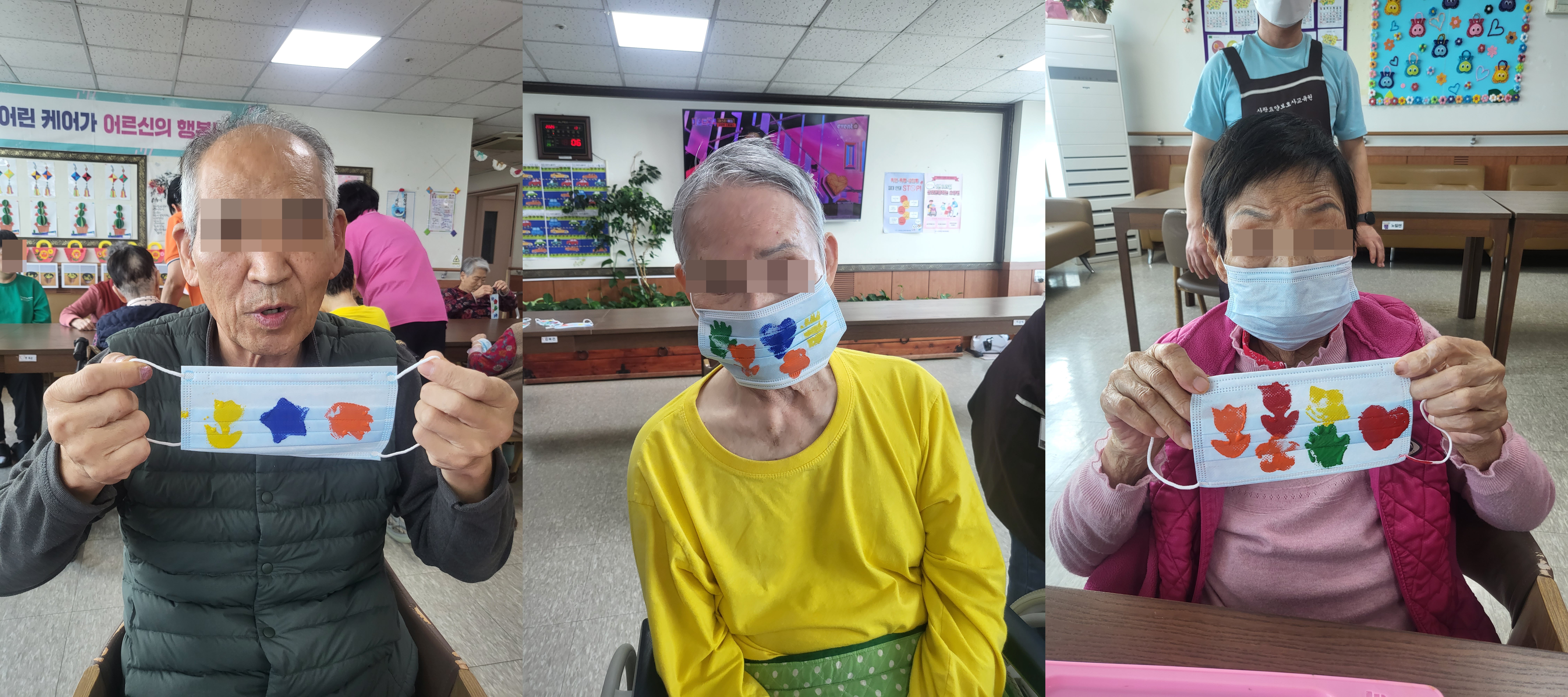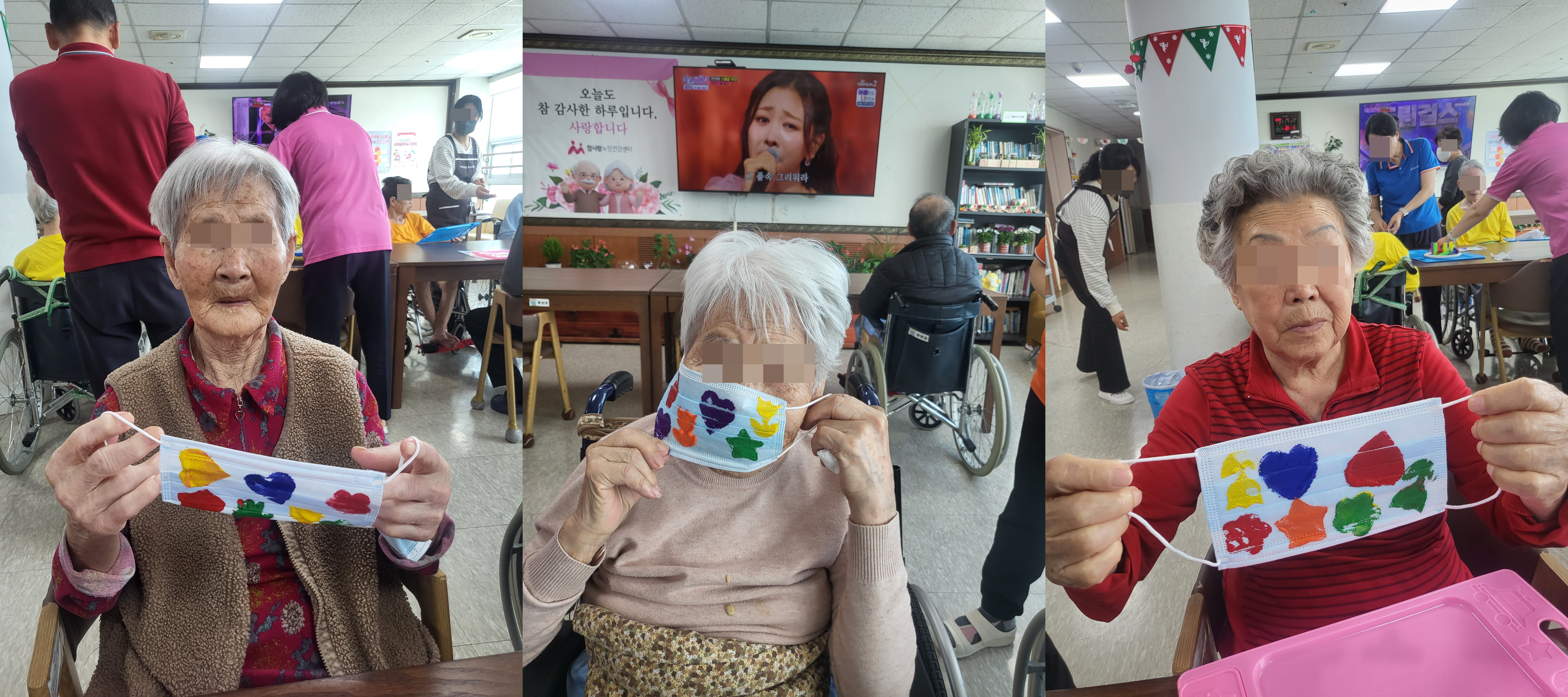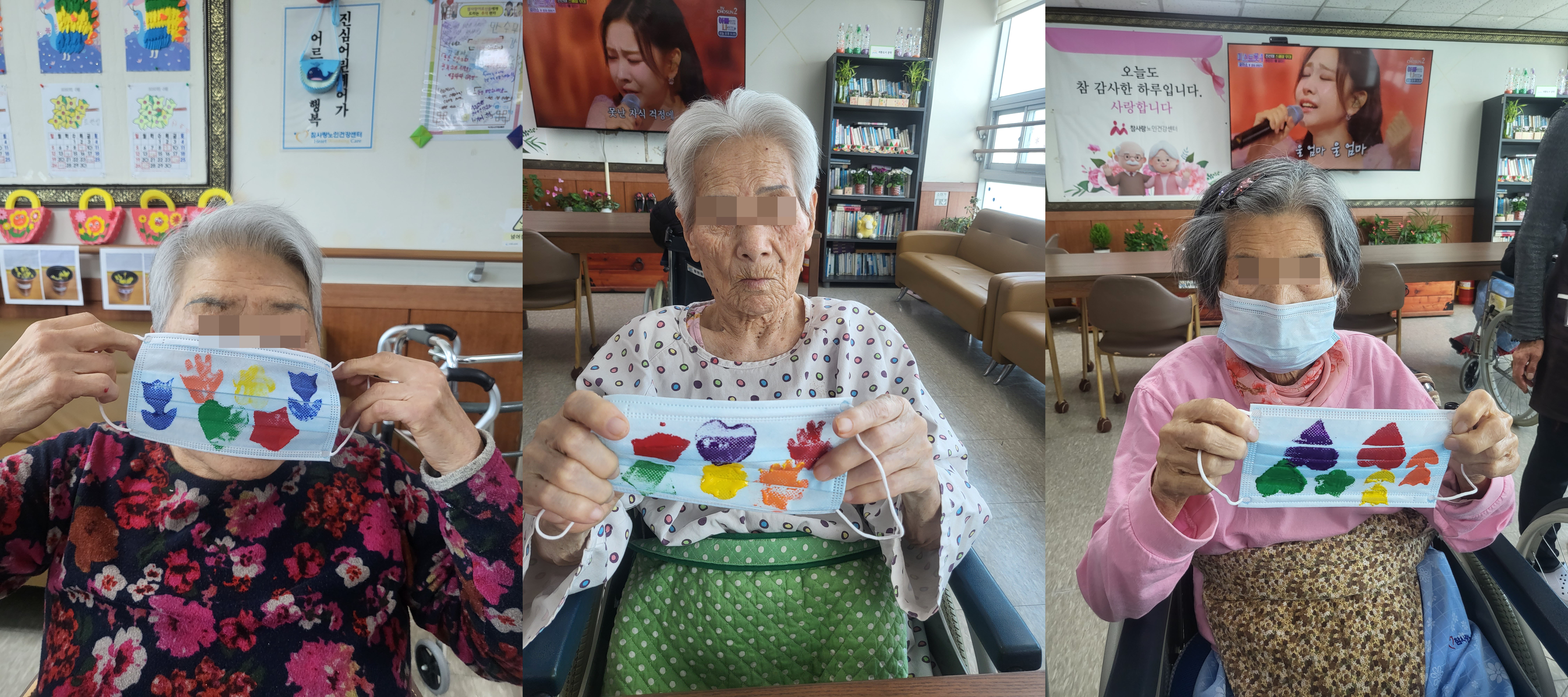 어르신들이 마스크에 여러 모양 꽃,하트,별