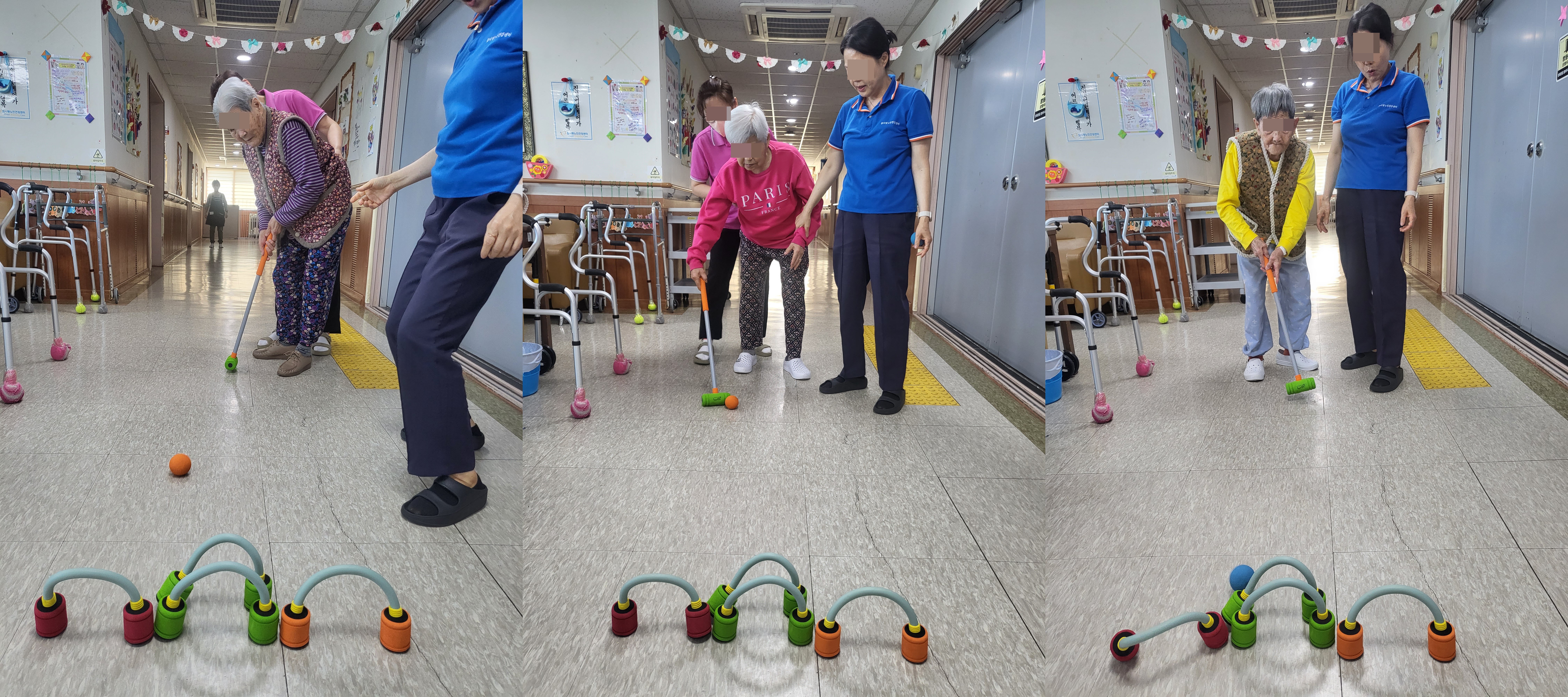 게이트볼채로 공을 쳐서 굴려서 몇번 해보시더니